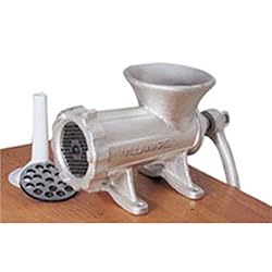 This meat grinder is made with heavy weight cast iron and hardened steel cutting parts.It also includes two disks, a knife and stuffing funnel. This model attaches to any bench top.
